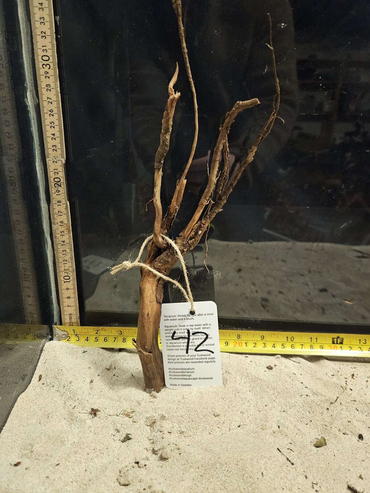 Placera som blickfång och komplettera med stenar, sand eller mindre grenar för att efterlikna flodbankar eller översvämmad skog. Förberedelse av roten innan användning Innan du placerar Tuskwood i akvariet rekommenderar vi att du sköljer och borstar igenom roten med vatten och en borste (t.ex. en diskborste) för att avlägsna löst organiskt material från torvmossen. Tuskwood är naturligt flytande när den är helt torr och behöver absorbera vatten innan den sjunker av sig själv. Det finns två vanliga metoder: 1 Vattensänkning