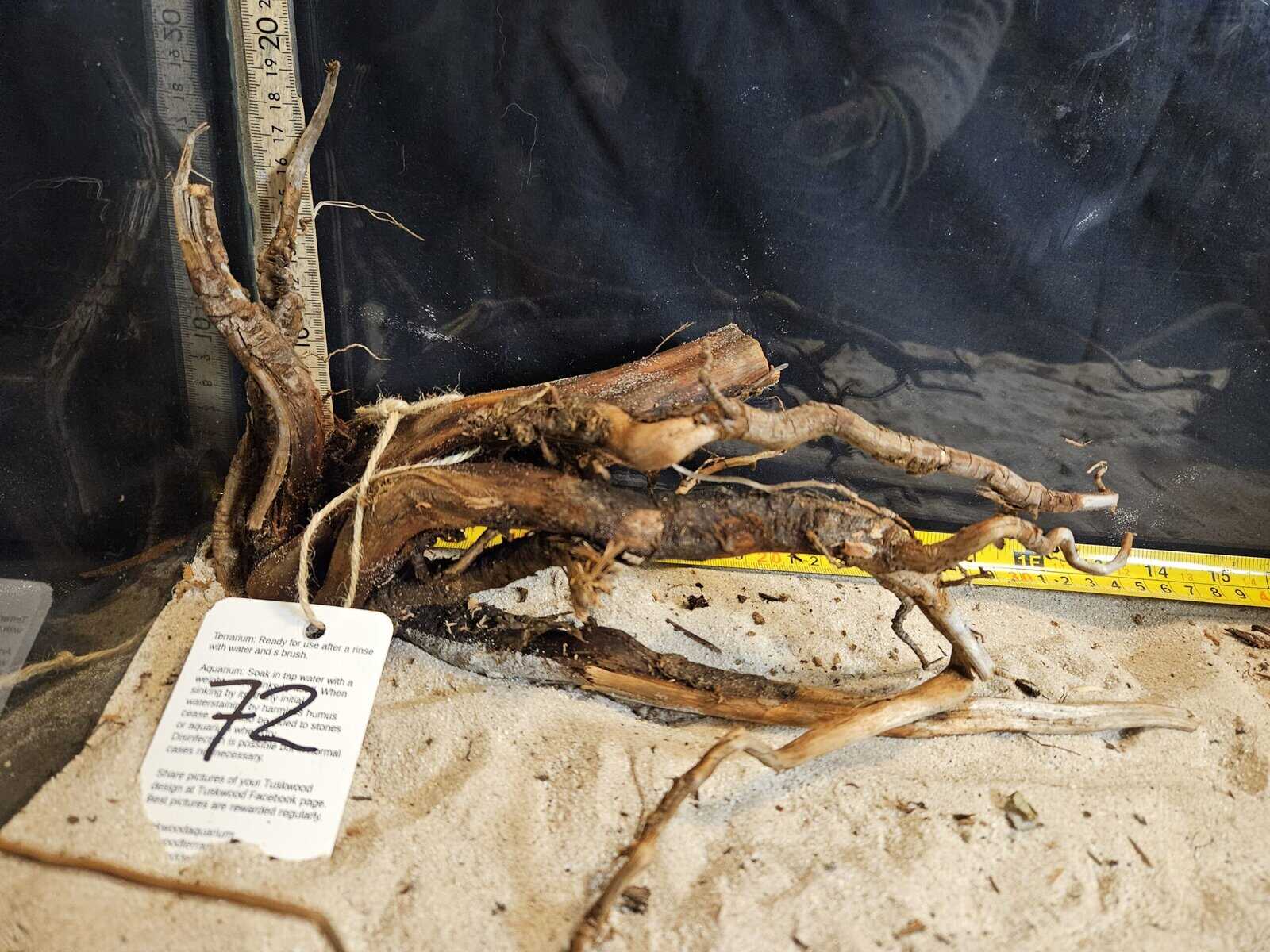 Placera som blickfång och komplettera med stenar, sand eller mindre grenar för att efterlikna flodbankar eller översvämmad skog. Förberedelse av roten innan användning Innan du placerar Tuskwood i akvariet rekommenderar vi att du sköljer och borstar igenom roten med vatten och en borste (t.ex. en diskborste) för att avlägsna löst organiskt material från torvmossen. Tuskwood är naturligt flytande när den är helt torr och behöver absorbera vatten innan den sjunker av sig själv. Det finns två vanliga metoder: 1 Vattensänkning