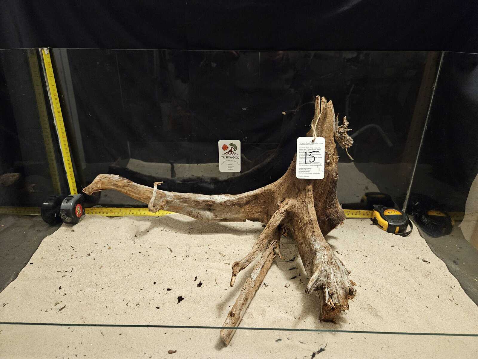 Placera som blickfång och komplettera med stenar, sand eller mindre grenar för att efterlikna flodbankar eller översvämmad skog. Förberedelse av roten innan användning Innan du placerar Tuskwood i akvariet rekommenderar vi att du sköljer och borstar igenom roten med vatten och en borste (t.ex. en diskborste) för att avlägsna löst organiskt material från torvmossen. Tuskwood är naturligt flytande när den är helt torr och behöver absorbera vatten innan den sjunker av sig själv. Det finns två vanliga metoder: 1 Vattensänkning